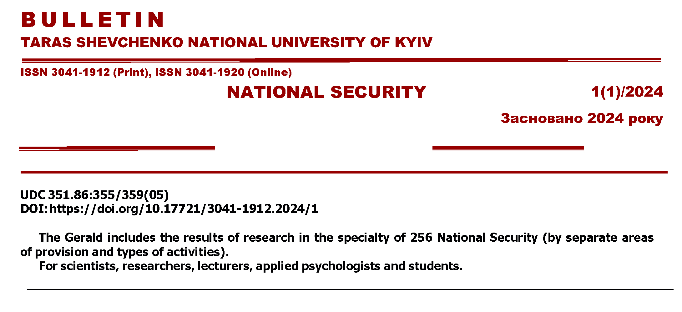 Том 1 № 1 (2024)«Вісник Київського національного університету імені Тараса Шевченка. Національна безпека» – періодичне рецензоване наукове видання відкритого доступу, в якому представлено дослідження актуальних питань теорії та методології забезпечення національної безпеки, формування механізмів та розробки технологій забезпечення національної безпеки, а також експертно-аналітичні дослідження у сфері міжнародної та національної безпеки.